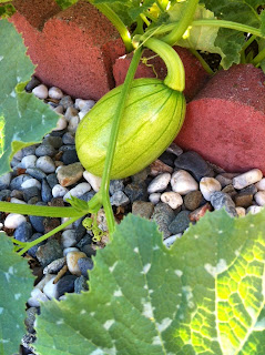 Two of my garlic plants have finally sprung through the ground. Just when I gave up on them, they appeared!Here we have three acorn squash and one zucchini. All are thriving.